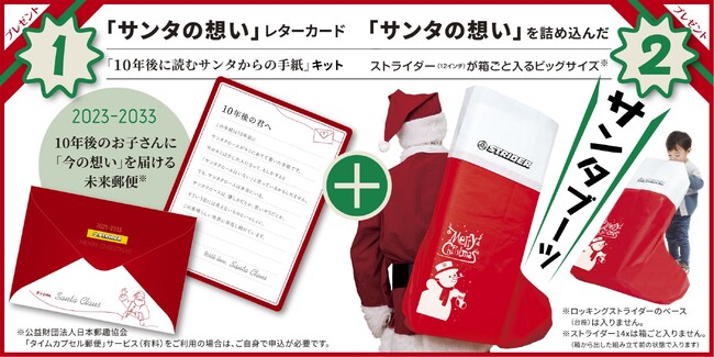 ストライダークリスマスキャンペーン期間内に、対象のストライダーをご購入いただくと、10年後に読むサンタからの手紙レターセットとサンタブーツがもらえます。数量限定、無くなり次第終了です。