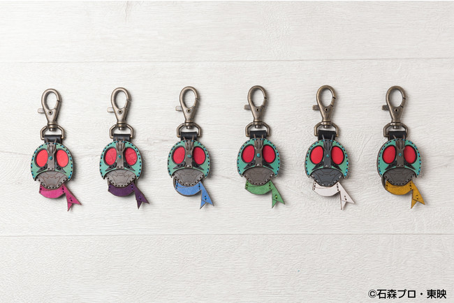 このたび、昭和・平成・令和と世代を超えて愛され続ける「仮面ライダーシリーズ」とのコラボレーションコレクションとして、OJAGA DESIGN ならではのカラフルなレザー、ハンドステッチの温もりある風合いにより、1971年~73年放送の「仮面ライダー」に登場する怪人「ショッカーライダーNo.1~No.6」のそれぞれのマスクを、こだわりのレザーキーホルダーに落とし込みました。