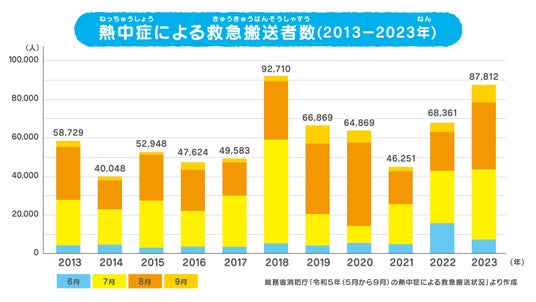 5月から9月の全国の熱中症による救急搬送者数は91,467人(2022年より20,438人増加)で前年(2022年)の約1.3倍でした。記録的な暑さとなった北海道と東北は前年の約2倍、8月は北海道と秋田県で前年の約10倍と大幅に増加しました。
