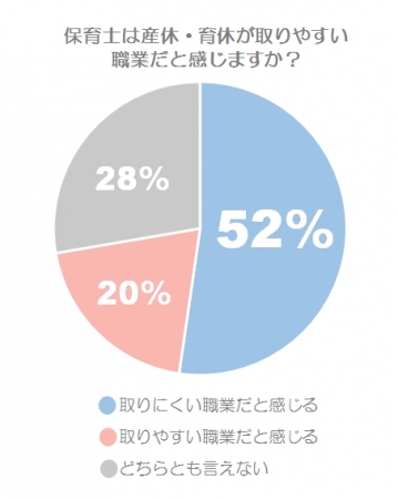 保育士という仕事について「産休・育休が取りやすい職業だと思う」と回答したのは、全体のわずか20%。それに対し「産休・育休が取りにくい職業だと思う」という回答は52%、「どちらとも言えない」が28%という結果になりました。