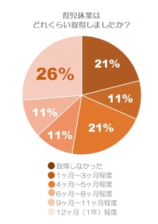 「育児休業はどれくらい取得しましたか?」という質問に対し、回答が最も多かったのは「12ヶ月(1年)程度」で26%。次いで「4~5ヶ月程度(21%)」「育休は取得しなかった(21%)」という回答が多く寄せられました。