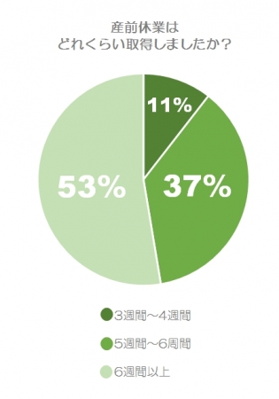 まず、出産予定日の6週間前(双子以上の場合には14週間前)から請求すれば取得できる「産前休業」について、どれ位の期間取得できたかを聞いたところ、「6週間以上」が過半数の53%、続いて「5~6週間(37%)」、「3~4週間(11%)」という回答結果になりました。