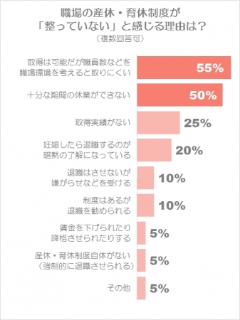 しかし一方で、「制度が整っていない」と感じている方にその理由を聞いたところ、「取得自体は可能だが、職員数などの職場環境を考えると取りにくい(55%)」「十分な期間の休業ができない(50%)」「取得実績がない(25%)」など、制度自体はあるものの、その利用に課題がある現状が伺えました。