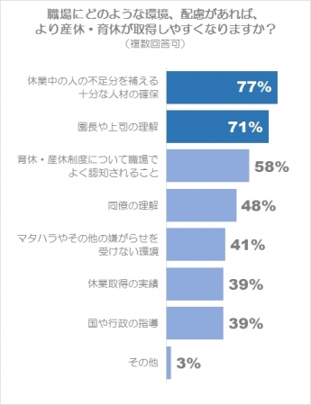 最も多く望まれた改善点は「休業中の人の不足分を補える十分な人材の確保」で、回答者の実に77%が必要性を感じていることがわかりました。続いて多かったのが「園長や上司の理解(71%)」、「産休・育休制度について職場でよく認知されること(58%)」。