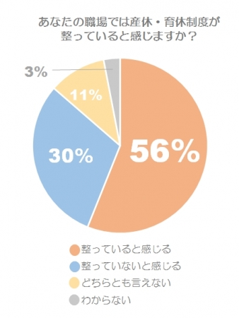 「あなたの職場では産休・育休制度が整っていると感じますか?」という質問については、「整っていると感じる」という回答が56%、「整っていないと感じる」という回答が30%。「どちらとも言えない」11%、「わからない」3%という結果になりました。