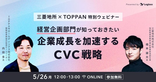 求人広告型のM&Aマッチングプラットフォーム「M&Aクラウド」や事業会社・CVCからの資金調達ができる「資金調達クラウド」を運営する、株式会社M&Aクラウド(本社:東京都千代田区、代表取締役CEO:及川 厚博、以下「当社」)は、クラウド経営管理システム「Loglass」を運営する、株式会社ログラス(本社:東京都港区、代表取締役CEO:布川 友也、以下「ログラス」)と共催で、5月26日(月)にウェビナーを開催します。ゲストには三菱地所とTOPPANホールディングスのCVC担当者をお招きし、「経営企画部門が知っておきたい、企業成長を加速するCVC戦略」をテーマにパネルディスカッションを開催します。