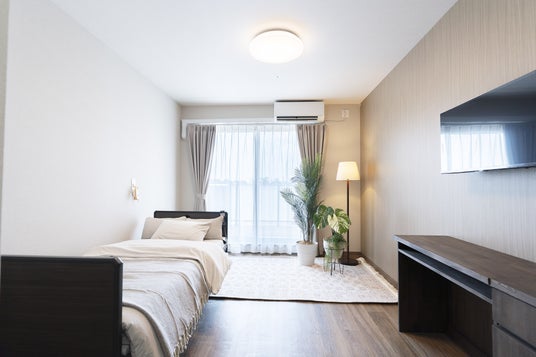1階フロアは窓の外に植栽の緑が広がり、癒しを感じさせる穏やかな環境でお過ごしいただけます。2階フロアは見晴らしがよく、明るい雰囲気の居室となっています。3階フロアは、廊下がカーペット敷きになっているほか、居室には壁掛けの32インチのテレビやデスク、チェストを備え付けています。32インチテレビはインターネットに接続してさまざまなコンテンツを利用できるスマートテレビとなっており、お好きな動画作品を居室でご覧いただけます。(動画配信サービスなどは別途契約が必要となります。)
