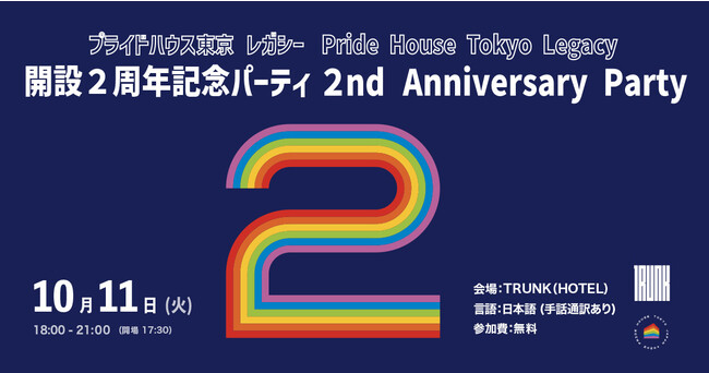2020年10月11日にオープンした『プライドハウス東京レガシー』は、おかげさまで、2022年10月11日(火)に、開設2周年を迎えます。多くのLGBTQ+活動団体が生まれるきっかけとなった記念日でもある、国際カミングアウトデー (National Coming Out Day)に、これまでご支援・ご協力くださった、「プライドハウス東京」コンソーシアムの団体・専門家・企業や、ご後援の大使館、その他のご協力関係者のみなさまへ、感謝の気持ちを込めて、プライドハウス東京レガシー・開設2周年記念パーティーを開催いたします。