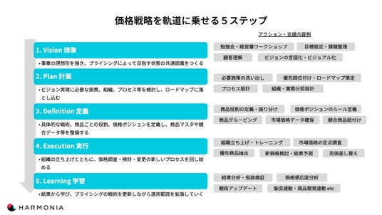 価格戦略を再定義し、軌道に乗せるまでのプロセスは個別性・複雑性が高いものではありますが、ハルモニアではそれらを5つのステップに整理しています。
