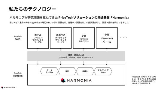 今回のサービスは、ハルモニアが研究開発を重ねてきたPriceTechソリューションの共通基盤「Harmonia」を活用した、特定業界向けSaaSの位置付けです。旧サービス名称であるMagicPriceの時代から、ホテル業界向け、高速バス業界向け、小売業界向けと、開発・提供を続けてまいりました。