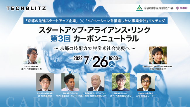 第3回目は世界的な関心事であり、京都府でも注力中(※)の「カーボンニュートラル」をテーマに、関連スタートアップ企業がピッチに登壇し、特徴的な技術やビジネスモデル等を披露します。