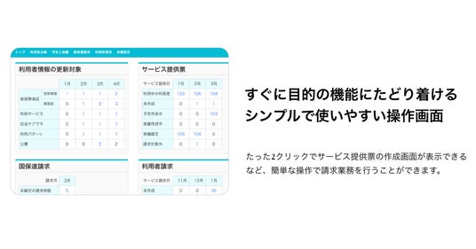 「Rehab Cloud レセプト」では、業務プロセスに寄り添った画面設計で、大幅にクリック数を削減しました。誰でも使い慣れることができ、業務の属人化を防ぐことができます。