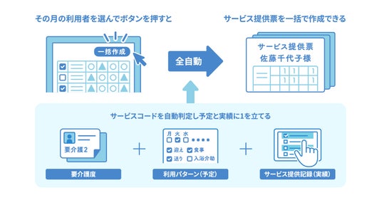 従来の請求業務においては、毎月、サービス提供票を元に利用者全員分の提供予定を介護ソフトへ手入力する必要があり、その入力作業には、かなりの労力を要します。また、利用者の要介護度の変化や状況に合わせて、サービスコードを設定し直す作業にも負荷がかかっています。