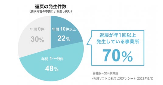 当社のアンケート調査では、介護事業所の約7割が少なくとも年1回以上の返戻(請求内容の不備による差し戻し)が発生しているという結果となり、実態として返戻が常態化している状況といえます。