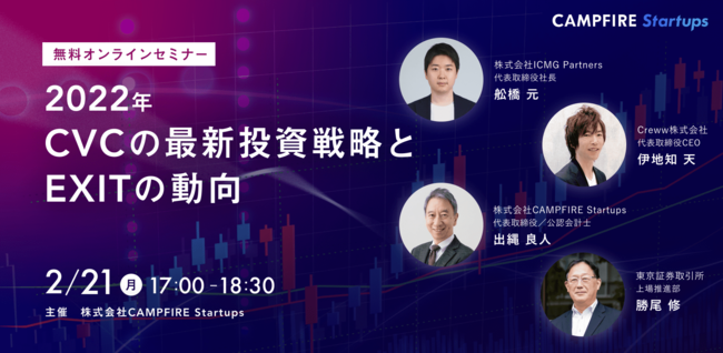 株式投資型クラウドファンディング「CAMPFIRE Angels」を運営する、株式会社CAMPFIRE Startups(本社:東京都渋谷区 / 代表取締役:出縄 良人 / 以下、当社 )は、スタートアップ向けの資金調達サポート事業に限らず、大手企業のCVC投資事業に対する包括的な支援事業をスタートいたしました。これを記念し、2022年2月21日(月)17:00より、CVC向けの無料オンラインセミナー「CVCの最新投資戦略とEXITの動向」を開催いたします。