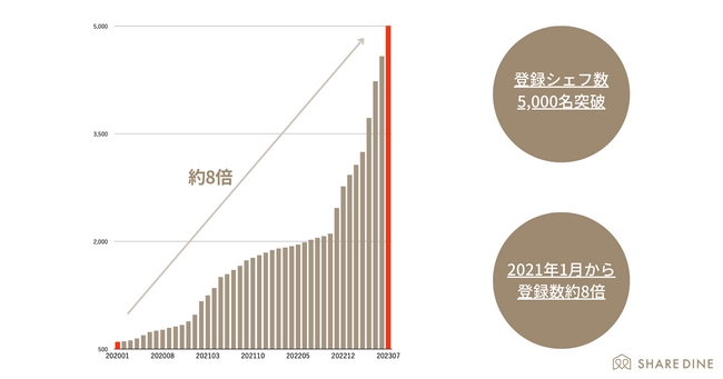 ご家庭向けの出張シェフサービス「シェアダイン https://sharedine.me/ 」(以下、シェアダイン)と飲食事業者様向けの即戦力料理人マッチングサービス「スポットシェフ https://spot-chef.com/ 」(以下、スポットシェフ)を運営する株式会社シェアダイン(本社:東京都港区、共同代表:井出 有希)は、登録するシェフの人数が5,000名を突破したことをお知らせします。