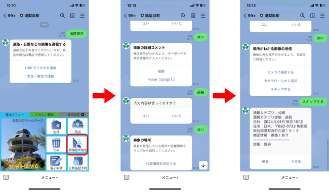 道路から公園などの目撃情報を連絡できる「通報機能」を導入。ユーザーはチャットボットの案内に従い、現場の写真や位置、詳細情報を送ることで通報することが可能です。