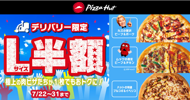 「カズの贅沢ビーフ&ポーク」、「ムックの満足ビーフ&チキン」、「ハットの特選プルコギ&イベリコ」の極上の肉ピザが1枚でもおトクに!デリバリー限定でLサイズ半額になる夏の肉ピザフェスの超おトクなキャンペーン!