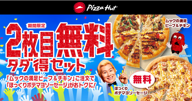 ピザハット 夏の肉ピザフェスティバル その3.:「ムックの満足ビーフ&チキン」ご注文でなんと「ほっくりポテマヨソーセージ」が無料になる「2枚目無料 タダ得セット」!