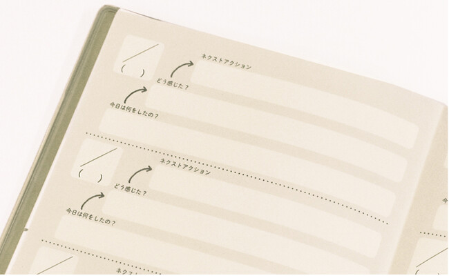 色々な日記案を考えては没というディスカッションを重ねた末、考案したのが「出来事」「気づき」「次への行動」を各1行で記入する「3STEP日記」です。