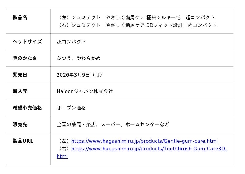 Haleonジャパン株式会社(代表取締役社長:野上 麻理、本社:東京都港区)は売上No.1*1のハミガキブランド「シュミテクト」より、届きにくい部位までしっかり磨ける超コンパクトヘッドを採用したハブラシ『シュミテクト やさしく歯周ケア 超コンパクト ハブラシ』を、2026年3月9日から全国で新発売いたします。