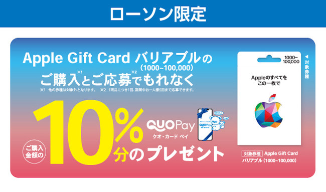 12月28日(火)から1月3日(月)までの期間に、全国のローソンで『Apple Gift Card バリアブル(1000-100,000)』をご購入いただき、キャンペーンサイトよりご応募いただくと、応募者全員に『Apple Gift Cardバリアブル(1000-100,000)』のご購入金額10%相当分のQUOカードPayをすぐにプレゼントします。