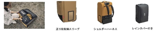 上下2つのフロントポケットと中のメッシュコンパートメントにより着替えやキャンプ製品を分けて収納することが可能です。宅急便で送ることのできる140cmサイズで、送り状専用収納スリーブも外側にあります。衝撃にも強い準ハードシェル仕様、悪路では背負って移動できる取り外し可能なショルダーハーネス、レインカバーもついているので、不測の事態でも安心して持ち運ぶことができます。