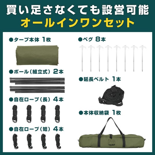 タープ本体以外に必要なポール2本、ロープ各4本(長・短)、ペグ8本をセットにしました。本体収納袋もついており、女性でも持ち運びしやすいサイズです。
