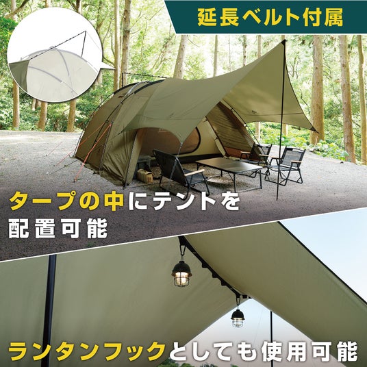 延長ベルトを利用し、テントと隣接させてタープを張れば、雨が降った時でも濡れることなく、テントからタープまで移動が可能になります。延長ベルトは、タープ内側に設置することで、ランタンフックとしても活用できます。
