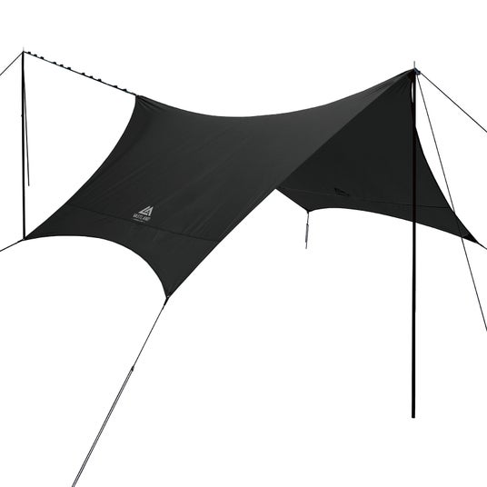 このタープは、キャンプ時に日差しや雨対策としてタープを張りたいけれど、本体以外にどんなアイテムを揃えればよいかわからない…という方に向け、基本張りに必要なアイテムだけでなく、テントとタープの隣接が可能になるアイテムを揃えた、スターターモデルです。
