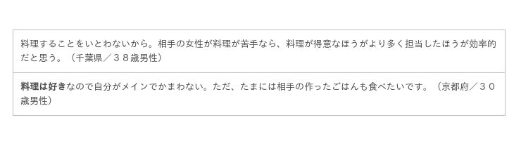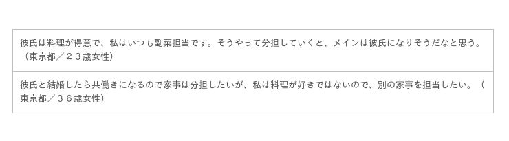 女性のコメントからは「料理は妻が担当」という固定観念に反発する意見がある一方で、「キッチンに入ってほしくない」といったこだわりの強い料理好きな人もいることがわかりました。一緒に暮らす上で効率的に役割分担をして、毎日の料理もストレスなく担当し合いたいと考える女性が多いようです。