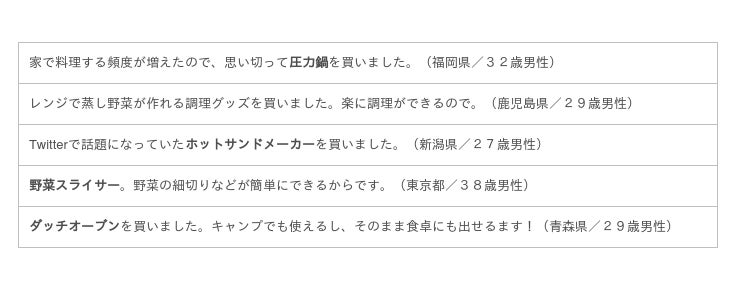 男性・女性にかかわらず外出自粛期間中に料理をしている人は、さまざまな調理器具を買い足しているようです。調理器具を買い足すことで、料理のバリエーションがさらに広がった人が増えているかもしれません。