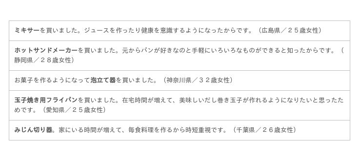 外出自粛期間が長引き自宅にいる時間が長くなったために、買い足した調理器具があるかについて、聞いてみました。