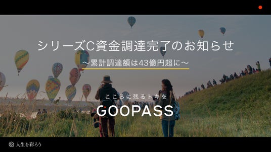 人生を彩る趣味のプラットフォームGOOPASS株式会社(本社:東京都新宿区、代表取締役:高坂勲、以下:GOOPASS)は、ヤマハミュージックエンタテインメントホールディングス、ソニーペイメントサービス、横浜キャピタル、NCBベンチャーキャピタル、ツネイシキャピタルパートナーズ、ひだしんイノベーションパートナーズなどを主な引受先とした延長ラウンドを経て、シリーズCラウンドの資金調達を完了しましたことをお知らせ致します。これにより、第三者割当増資および、融資、機材調達枠としての累計調達額は約43億円となります。