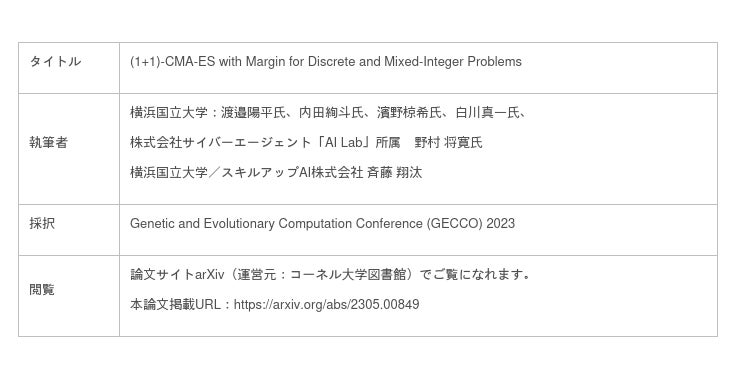 本論文は、横浜国立大学の渡邉陽平氏、濱野椋希氏、内田絢斗特任助教、白川真一准教授、株式会社サイバーエージェントの人工知能技術の研究開発組織「AI Lab」に所属する研究員の野村将寛氏および横浜国立大学/スキルアップAI株式会社の斉藤翔汰による共著論文となっています。斉藤を含む研究グループは昨年の GECCO 2022にて 共著論文「CMA-ES with Margin: Lower-Bounding Marginal Probability for Mixed-Integer Black-Box Optimization」を提案しており、以降もアルゴリズムの改善に努めていました。
