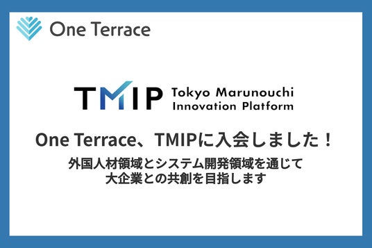 外国人材の紹介・育成、システム開発創事業を展開する株式会社One Terrace(東京都港区、代表取締役:石中達也)は、 Tokyo Marunouchi Innovation Platform(以下、TMIP)にスタートアップ会員として入会したことをお知らせいたします。