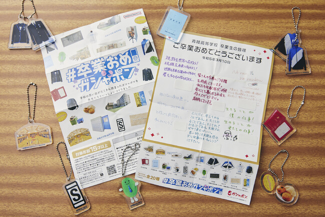 本企画では、卒業生273名のために、青稜高等学校の校舎や制服、生徒手帳、近隣のパン屋など、高校生活の思い出が詰まったオリジナルアクリルチャーム(全20種)を制作。卒業式当日、最後のホームルームの時間中、校舎内に約100面のガシャポンマシンをサプライズで設置し、卒業生の皆さんにこの日限定の特別なガシャポンをプレゼントしました。