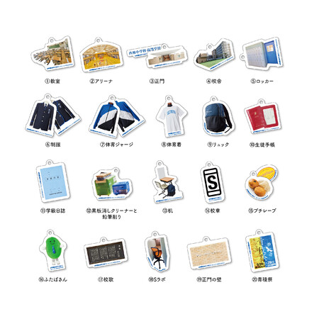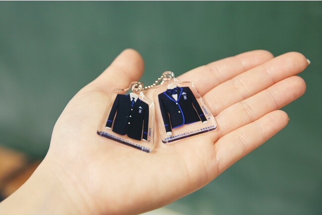 本企画では、青稜高等学校での学生生活の思い出が詰まったスポットやアイテムをプリントした、オリジナルア クリルチャームを制作しました。校舎・制服・生徒手帳・近隣のパン屋など、全 20 種類の特別なラインアップは、実際に青稜高等学校で学生生活を送っている教員や生徒会役員とともに決定しています。