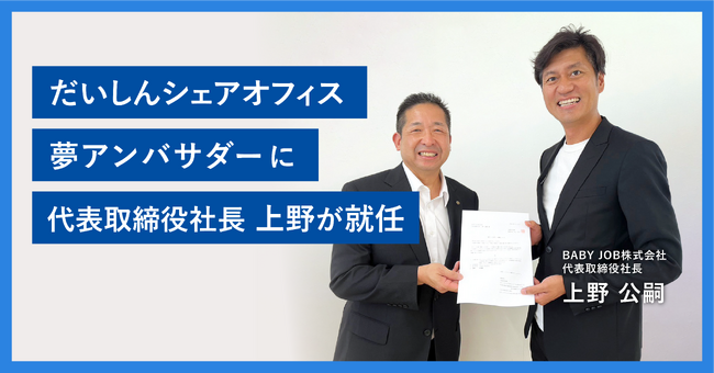 保育施設向けおむつのサブスク「手ぶら登園」や保育施設探しをサポートする「えんさがそっ♪」など、子育て支援サービスを運営するBABY JOB株式会社の代表取締役社長である上野公嗣が、2023年7月10日より大阪信用金庫が手がけるだいしんシェアオフィスの「夢アンバサダー」に就任したことをお知らせします。