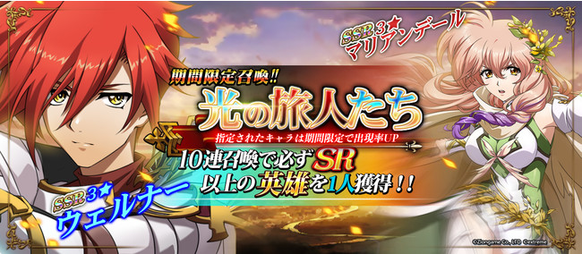 『光の旅人たち』は10連召喚で必ずSR以上の英雄を一人獲得できる、期間限定召喚です。SSRウェルナー、SSRマリアンデールの出現確率が期間限定でアップします。
