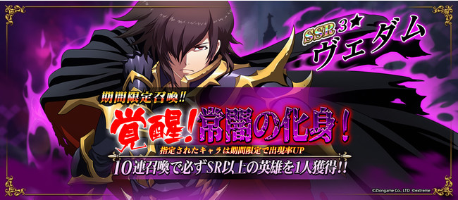 SSR ヴェダムは通常の英雄召喚や他の期間限定召喚では出現せず、期間限定召喚『覚醒!常闇の化身』でのみ獲得可能となります。