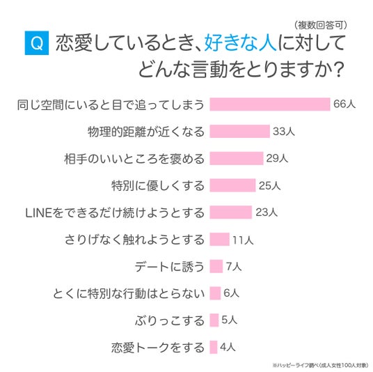 成人女性100人に、好きな男性に対してどんな言動をとるか聞いたところ、「同じ空間にいると目で追ってしまう」という回答が最多でした。