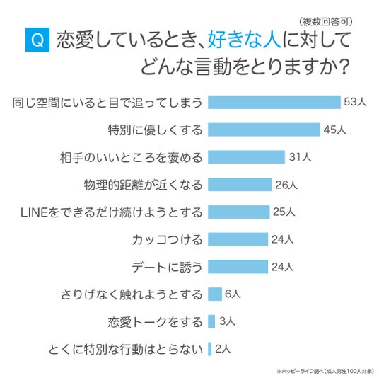 成人男性100人に、好きな女性に対してどのような言動をとるか聞いてみたところ、「同じ空間にいると目で追ってしまう」という回答が最多でした。