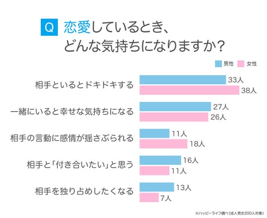 成人男女200人に、恋愛しているとどんな気持ちになるか聞いたところ、「相手といるとドキドキする」という回答が最多でした。