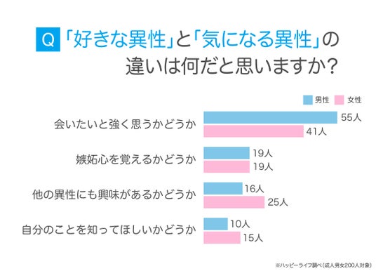 そこで成人男女200人に、「好きな異性」と「気になる異性」の違いを聞いてみたところ、男女ともに「会いたいと強く思うかどうか」が最多回答となっています。