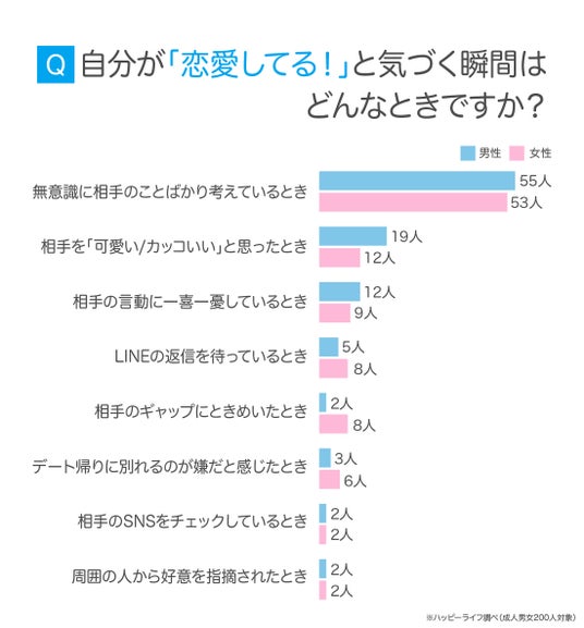 成人男女200人に、自分が恋愛していることに気づく瞬間を聞いたところ、「無意識に相手のことばかり考えているとき」が半数を超えて最多でした。
