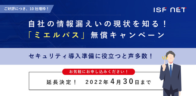 ITインフラソリューションを中心に、クラウド環境や、ネットワークシステムの構築・保守・運用におけるサービスを提供する、株式会社アイエスエフネット(本社:東京都港区、代表取締役:渡邉幸義、社員数:2,328名)は、実施中の「ミエルパス無償キャンペーン 」を15社に増枠し、さらに期間を2022年4月30日まで延長することを決定しました。