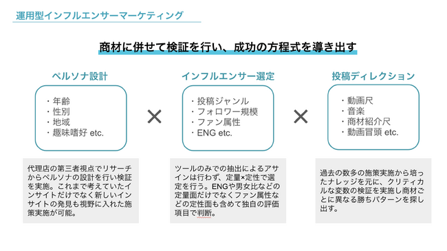 そこで今回FinTでは単発ではなく、施策を積み重ねるほどより成功確度が高まる「運用型インフルエンサーマーケティング」のプラン提供を開始しました。これまで、FinTは、自社メディア「Sucle」、および、累計200社以上のSNSアカウント運用実績から、弊社独自の仮説検証スキームを確立してきました。この仮説検証スキームを、インフルエンサーマーケティング施策にも応用することによって、施策ごとに知見が溜まり続け、企業様それぞれの独自のインフルエンサーマーケティングにおける勝ちパターンを導き出すことが可能になります。