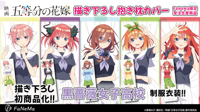 システムサービス株式会社(本社:東京都豊島区、代表取締役社長:田村宗弘)は、アニメ・マンガ・ゲーム作品等のキャラクター商品の企画・製作・販売をする自社ECサイト「FaNeMa」(URL:https://fanema.jp/)にて、『映画「五等分の花嫁」』より「抱き枕カバー」を発売いたします。