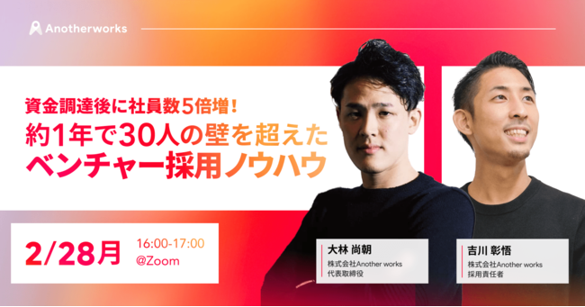 成功報酬無料のSaaS型複業マッチングプラットフォーム「複業クラウド」を展開する株式会社Another works(本社:東京都渋谷区、代表取締役CEO:大林 尚朝)は、ベンチャー企業経営者・採用責任者向けに「資金調達後に社員数5倍増!約1年に30人の壁を超えたベンチャー採用ノウハウ」と題した無料オンラインウェビナーを2022年2月28日(月)16:00から開催いたします。